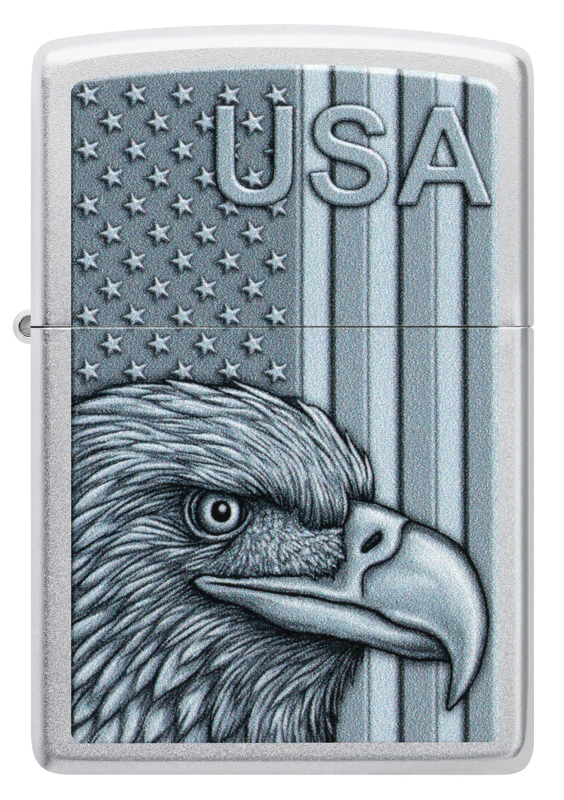 Demuestra tu amor por Estados Unidos con este clásico encendedor de cromo satinado. El diseño monocromático de la imagen a color imita la apariencia de un emblema tridimensional e incluye un águila feroz sobre una bandera estadounidense bajo la inscripción "USA". Viene en una caja de regalo. Para un rendimiento óptimo, llénalo con gasolina para encendedores Zippo.